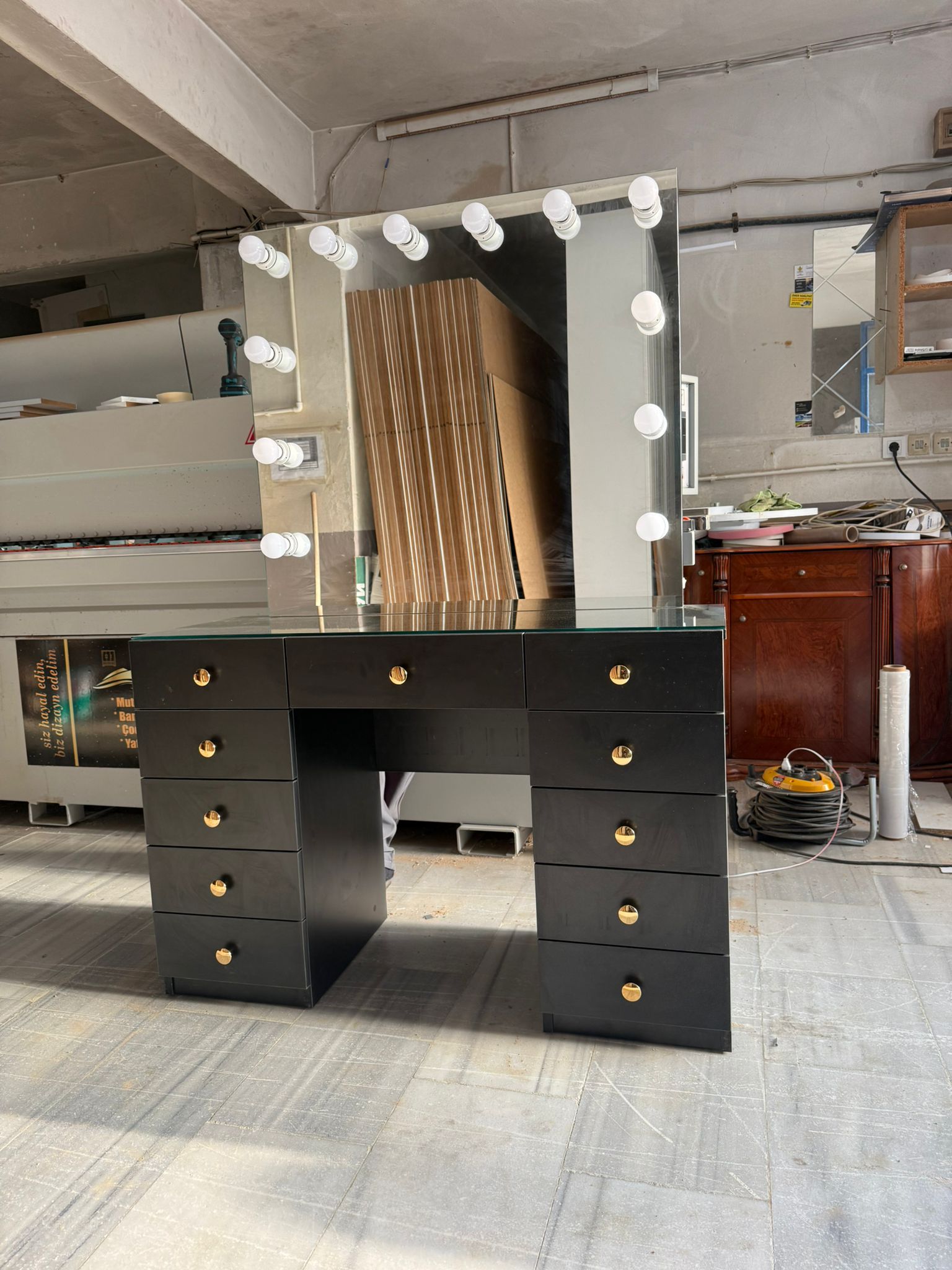 Geniş LED ışıklı aynası, makyaj yaparken yüzünüzü kusursuz şekilde aydınlatırken; siyah gövde üzerindeki altın kulplar modele özel bir lüks dokunuş katar.